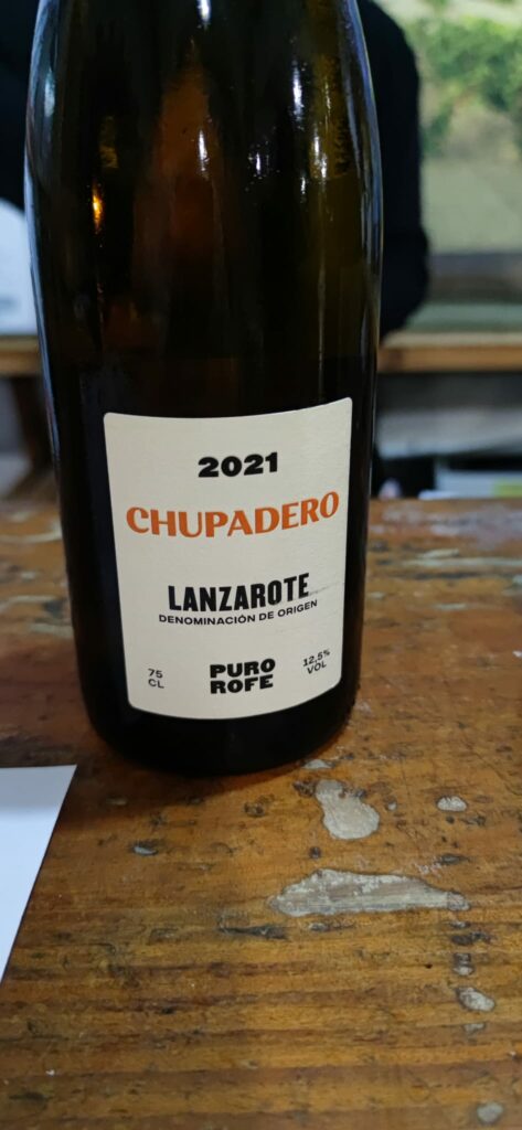 Chupadero de la Bodega Puro Rofe en la Isla de Lanzarote, debe su nombre al cráter de un volcán donde se encuentran los viñedos centenarios, nos encontramos con un vino 100% Listán Blanco.  La primera añada fue el año 2020, que se fermentó y maduró en barricas de jerez, en el año 2021 se maduró y fermento en barricas de roble neutro.