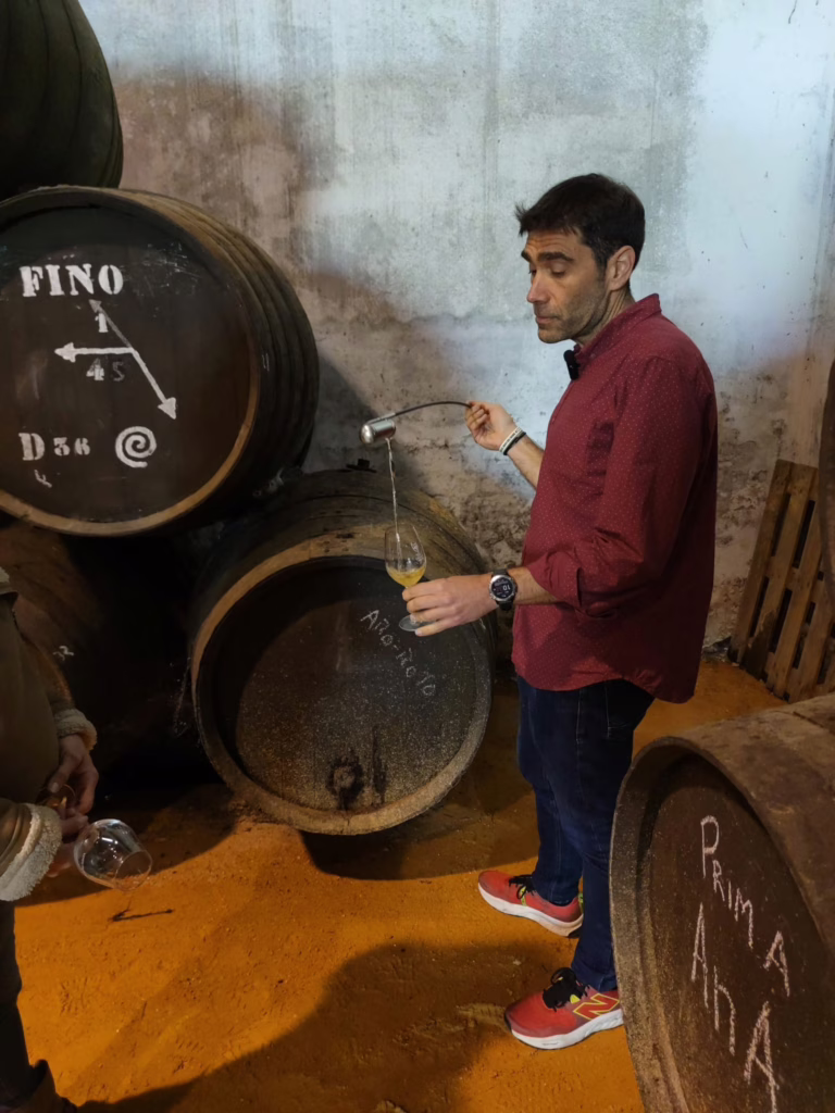 Durante la cata, probamos un palo cortado con sutiles recuerdos de su origen biológico. En nariz, es menos dulce que un amontillado, con matices florales elegantes; en boca, aparecen notas características de amontillado, de nuez, y con una profundidad y redondez únicas. Nos indica nuestro acompañante, que cuando realizan la elaboración de los olorosos , el palo cortado y sus creams, buscan un concepto más moderno y se decantan por vinos que sean sencillos de beber, algo que hemos comprobado.